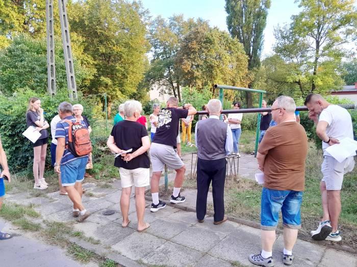 Galeryjka zdjęć: 1. Działka nr 1172/25, przedmiot pierwszego przetargu na sprzedaż w Starachowicach. 2. Zdjęcie skweru z ławkami i placem zabaw sprzed lat, obecnie nieużytkowany. 3. Wiceprezydent Elżbieta Gralec oraz prezydent Marek Materek. 4. Mieszkańcy z transparentami protestacyjnymi. 5. Miejscowy radny Dariusz Grunt oraz petycja mieszkańców. 6. Fragment ulicy 8 Maja, gdzie znajduje się nieruchomość. 7. Reakcje mieszkańców podczas konsultacji społecznych. 8. Budynek ratusza miasta Starachowice. Wszystkie zdjęcia ukazują kontekst pierwszego przetargu na sprzedaż działki i protesty mieszkańców starachowickiej dzielnicy.
