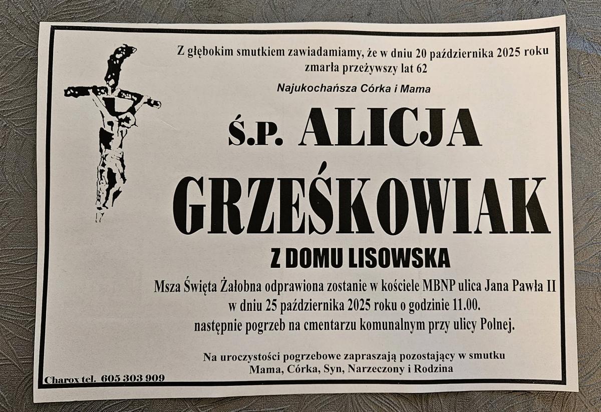Galeria zdjęć dedykowana pamięci Alicji Grześkowiak, ukochanej nauczycielki ze starachowickiego Zespołu Szkół Zawodowych nr 2. Po latach oddanej pracy w edukacji i trosce o bezpieczeństwo w miejscowych zakładach, społeczność szkoły żegna ją z żalem. Wyjątkowa osoba, przyjaciółka odeszła - słowa dyrektora, Grażyny Małeckiej. Ostatnie pożegnanie podczas Mszy Świętej Żałobnej 25 października, a następnie pochówek na cmentarzu komunalnym. Słowa kondolencji skierowanej do Rodziny i Bliskich Zmarłej wyrażają współczucie i żal po stracie.