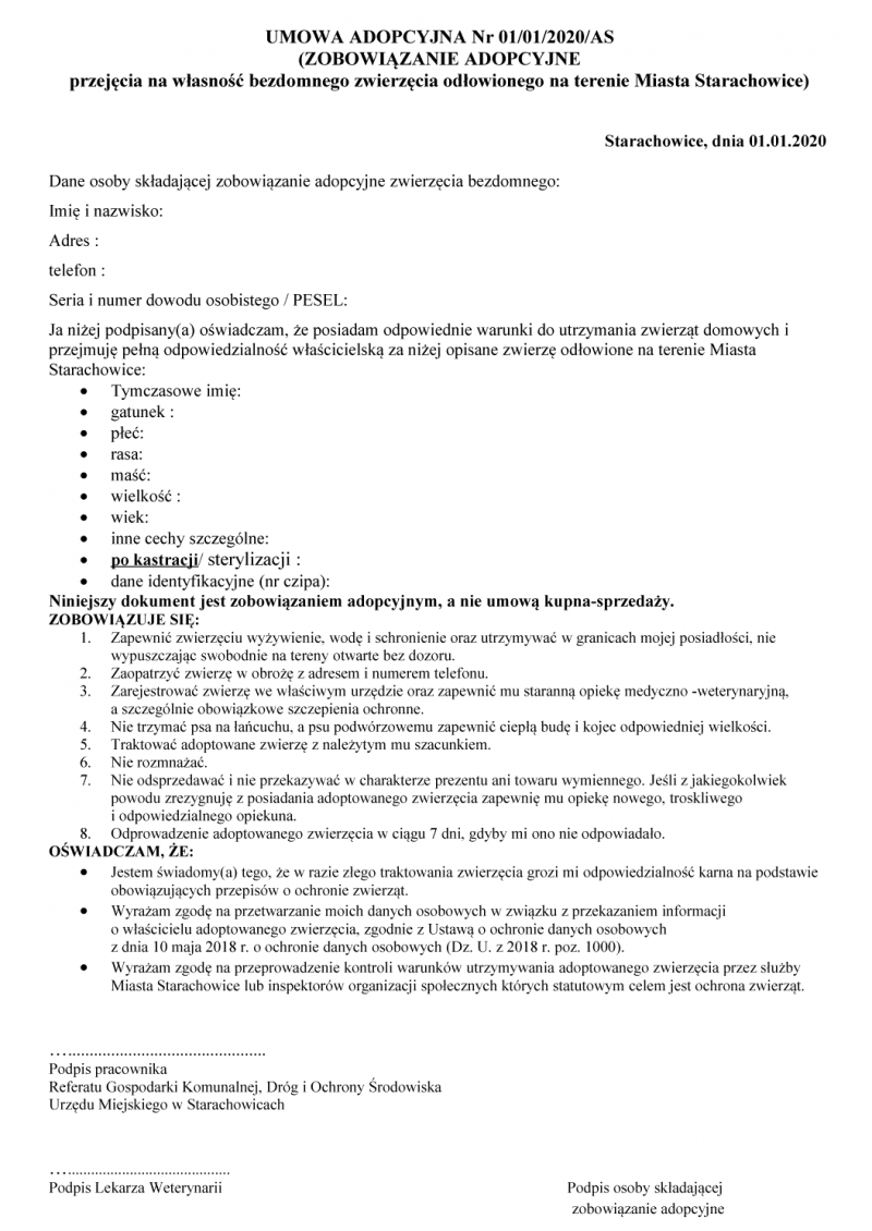 Dokumentem potwierdzającym adopcję jest UMOWA ADOPCYJNA, której wzór znajdziecie Państwo jako załącznik do niniejszego tekstu. Zawieracie ją Państwo w naszej Przychodni, jednak stroną owej umowy nie jesteśmy my, a właściwa w danym przypadku Gmina (Starachowice lub Brody). Zapisy umowy nie są, jak łatwo stwierdzić, przesadnie rozbudowane i zawierają się w raptem ośmiu punktach. Zgodnie z zapisem punktu ósmego macie Państwo prawo do zwrotu adoptowanego zwierzęcia w przeciągu kilku pierwszych dni po adopcji, gdyby coś poszło „nie tak”. Wiemy, że nie jest to komfortowa sytuacja (zwrot psa, czy kota), jednak czasem nie ma innego wyjścia i wówczas prosimy o skorzystanie z prawa, które Państwu przysługuje. Nie trzeba się przy tym tłumaczyć z powodów takiej decyzji.